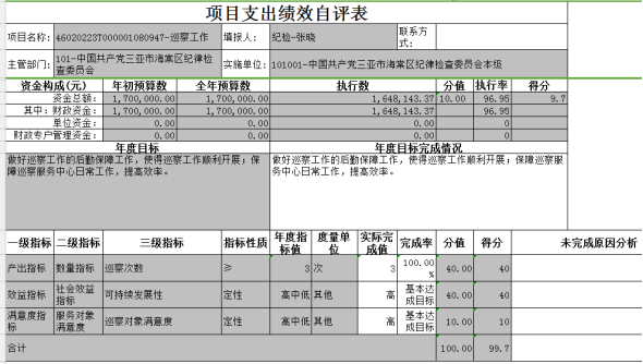 巡察工作项目绩效自评报告:根据年初设定的绩效目标,项目绩效自评得分为99.7分。全年预算数为170万元,执行数为164.81万元,完成预算的96.95%。项目绩效目标完成情况:基本误餐绩效目标。发现的主要问题及原因:一是由于国家监察体制改革等政策因素存在不可预见性和不确定性,预算编制时对项目支出情况考虑不全面,部门预算调整数据较大,预算执行存在偏差。二是全年预算执行不及时、不均衡,各季度支出进度不一。下一步改进措施:一是进一步加强预算编制工作,结合部门职责和年度工作任务科学合理地编制部门预算,不断提高预算可执行性。二是对未完成支出进度任务的项目,采取切实有效的措施推进项目实施,加快预算执行进度,确保财政资金使用效益。