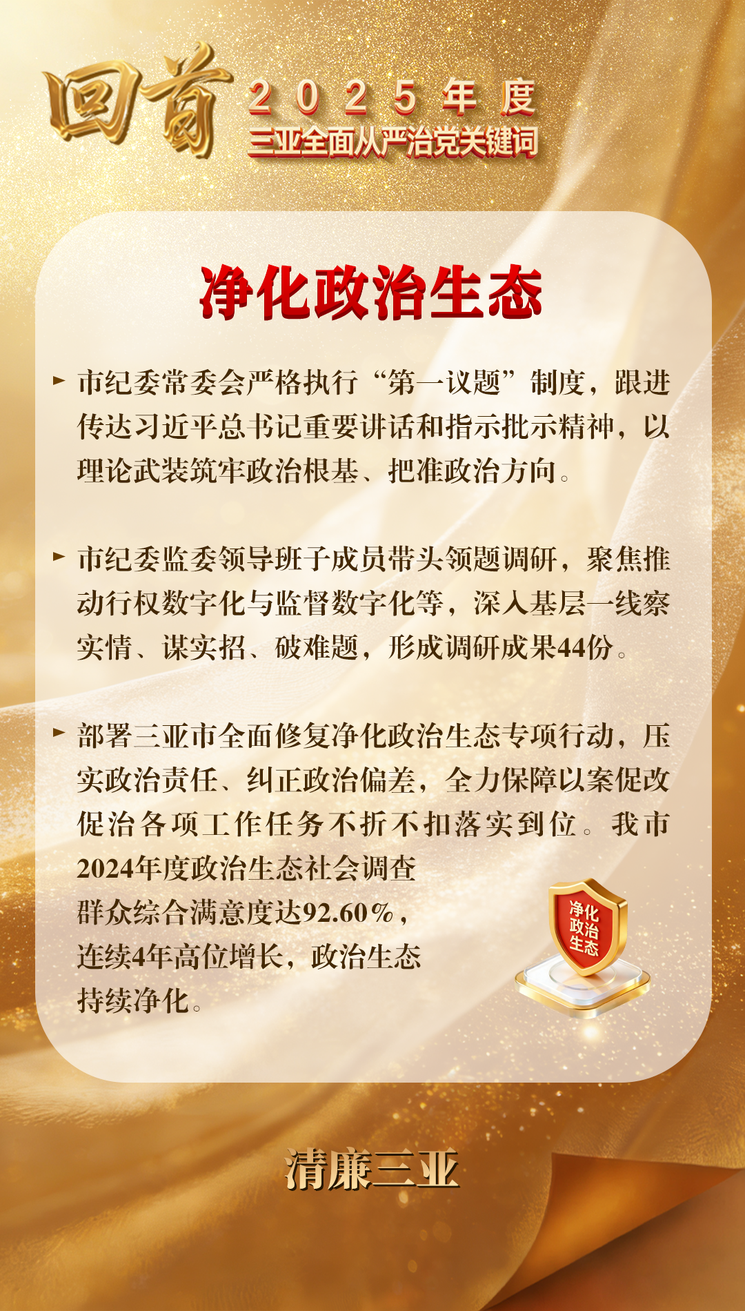 2025年,三亚市纪委监委深入学习贯彻习近平新时代中国特色社会主义思想特别是习近平总书记关于党的建设的重要思想,以彻底的自我革命精神协助市委净化政治生态,推动全市政治生态持续向上向好。