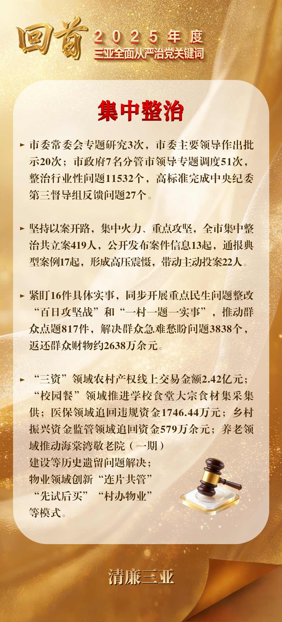 2025年,三亚市纪委监委深入贯彻落实集中整治总结暨再抓两年部署会要求,坚持人民至上,保持力度不减、尺度不松、标准不降,持续深化拓展整治成果,推动解决群众急难愁盼问题,让集中整治的治理成效更加可感可及。