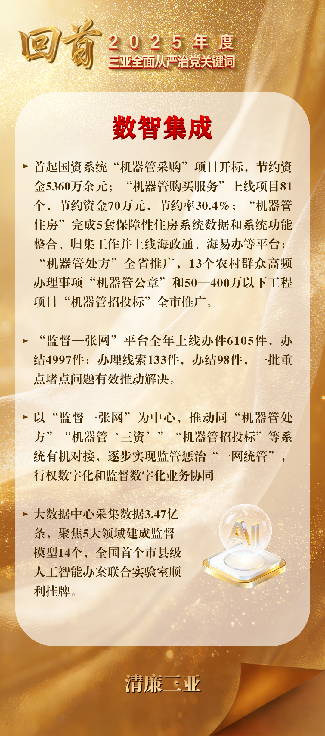 2025年,三亚市纪委监委贯彻落实习近平总书记关于“用科技手段加强监督”的重要指示精神,坚持以大数据信息化赋能正风反腐,推动以技术刚性约束权力弹性、以智能预警替代事后纠偏,更加有力凸显监督监管的治理效能。
